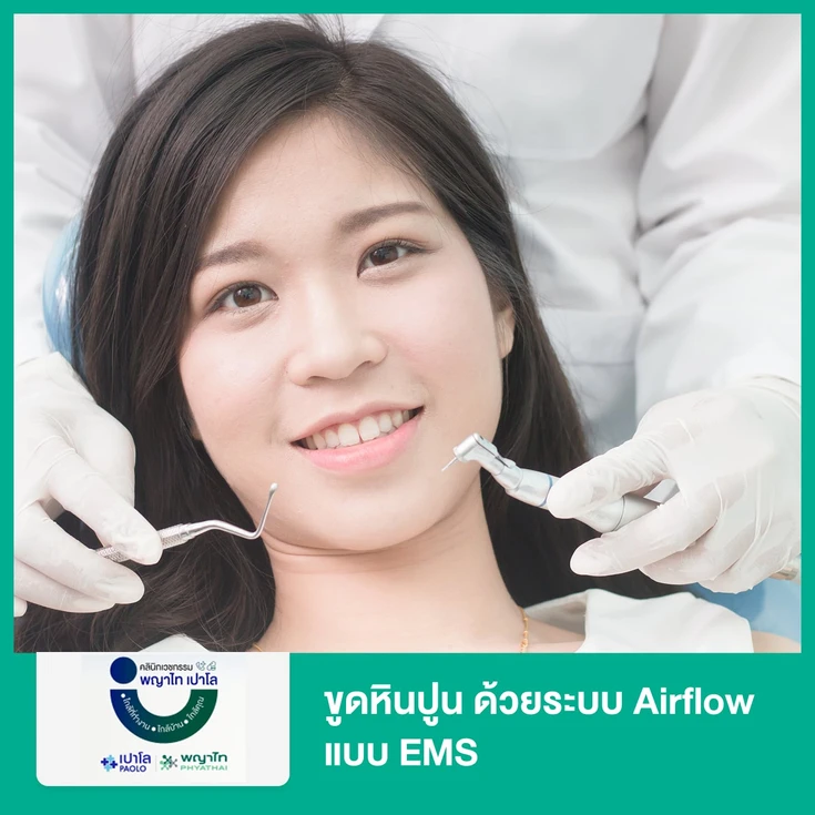 - การขูดหินปูน AirFlow แบบ EMS ใช้ละอองผงละเอียดผสมกับน้ำและลมแรงดันสูง พ่นไปบนผิวฟัน ช่วยกำจัดหินปูน โดยไม่ต้องใช้เครื่องขูดที่สั่นหรือกระเทาะหินปูนออกแรงๆ แบบเดิม
