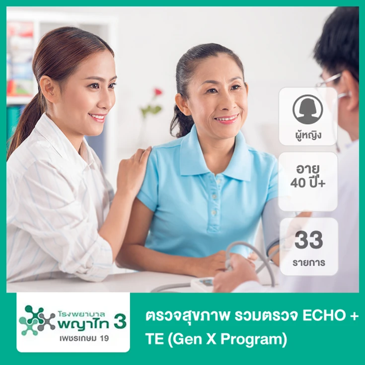 - ค่าตรวจสุขภาพ 33 รายการ รวมตรวจ ECHO + TE (Gen X Program) (ผู้หญิง 40 ปีขึ้นไป) มีรายการตรวจดังนี้