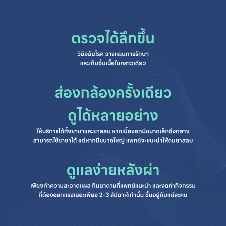 - ส่วนใหญ่เป็นหัตถการแบบผู้ป่วยนอก ใช้เวลาแค่ 15-30 นาที ไม่ต้องนอนรพ. พักฟื้นแค่ 1-2 ชั่วโมง