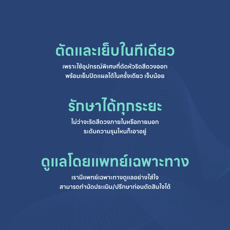 - แผลผ่าตัดมีขนาดเล็ก ประมาณ 2-3 มม. ไม่ต้องเย็บแผลหลังผ่าตัด