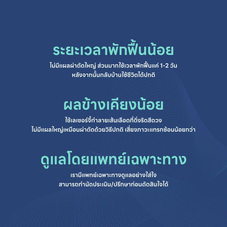 - ไม่มีแผลผ่าตัด มีโอกาสเกิดภาวะแทรกซ้อน หรือการติดเชื้อได้น้อยกว่า