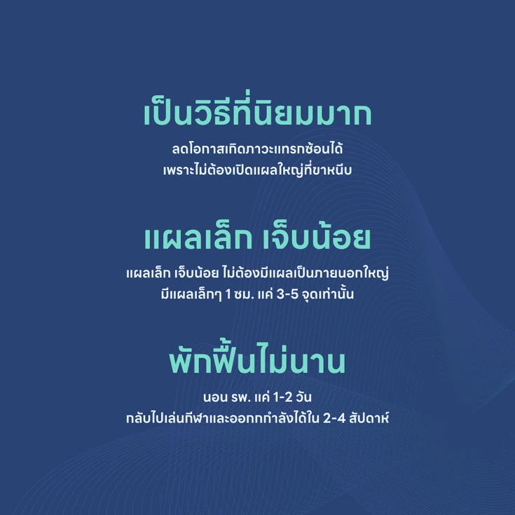 - ไม่ต้องผ่าตัดผ่านกล้ามเนื้อเข้าไป และใช้เวลาพักฟื้นน้อยกว่าการผ่าตัดแบบเปิด