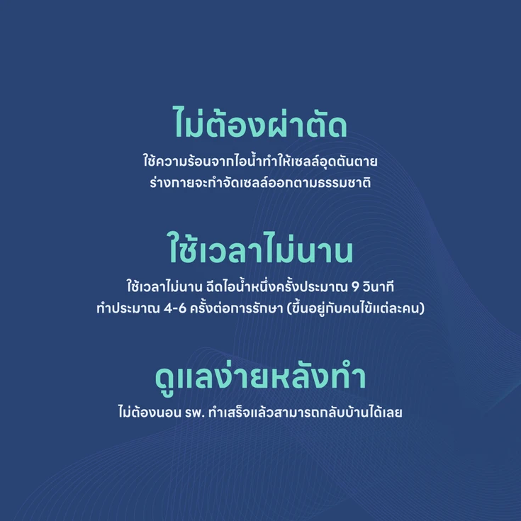 - ไม่ต้องผ่าตัด ไม่ต้องวางยาสลบ ใช้เพียงยาสงบประสาท ยาระงับความเจ็บปวด หรือยาชาเฉพาะที่ ไม่ต้องพักฟื้นที่โรงพยาบาล
